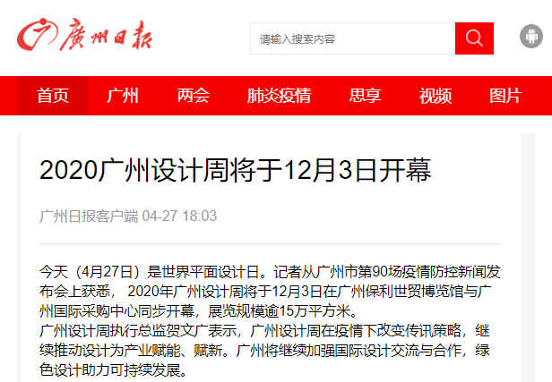 作為亞洲首屈一指的設(shè)計(jì)產(chǎn)業(yè)盛會(huì),廣州設(shè)計(jì)周在前不久的4月27日便應(yīng)廣州市委宣傳部邀請(qǐng)?jiān)趶V州市第90場(chǎng)疫情防控新聞發(fā)布會(huì)上進(jìn)行了2020廣州設(shè)計(jì)周展會(huì)項(xiàng)目發(fā)布,廣州設(shè)計(jì)周聯(lián)合創(chuàng)始人張衛(wèi)平先生、廣州設(shè)計(jì)周CEO賀文廣先生出席會(huì)議,并就2020廣州設(shè)計(jì)周有關(guān)情況做了詳細(xì)闡述,受到廣州市委宣傳部的高度認(rèn)可和大力支持,紛紛表示對(duì)12月3-6日如期舉辦的2020廣州設(shè)計(jì)周展會(huì)期待滿滿,《廣州日?qǐng)?bào)》等各路官方媒體更是拿出重要版面官宣報(bào)道。
